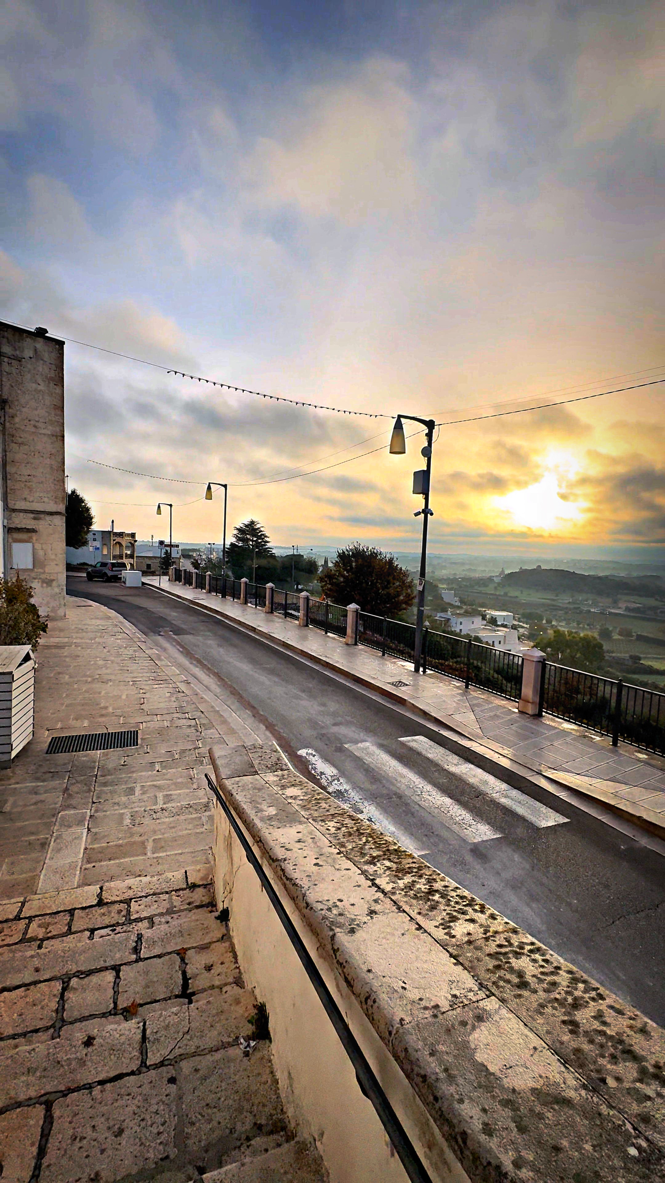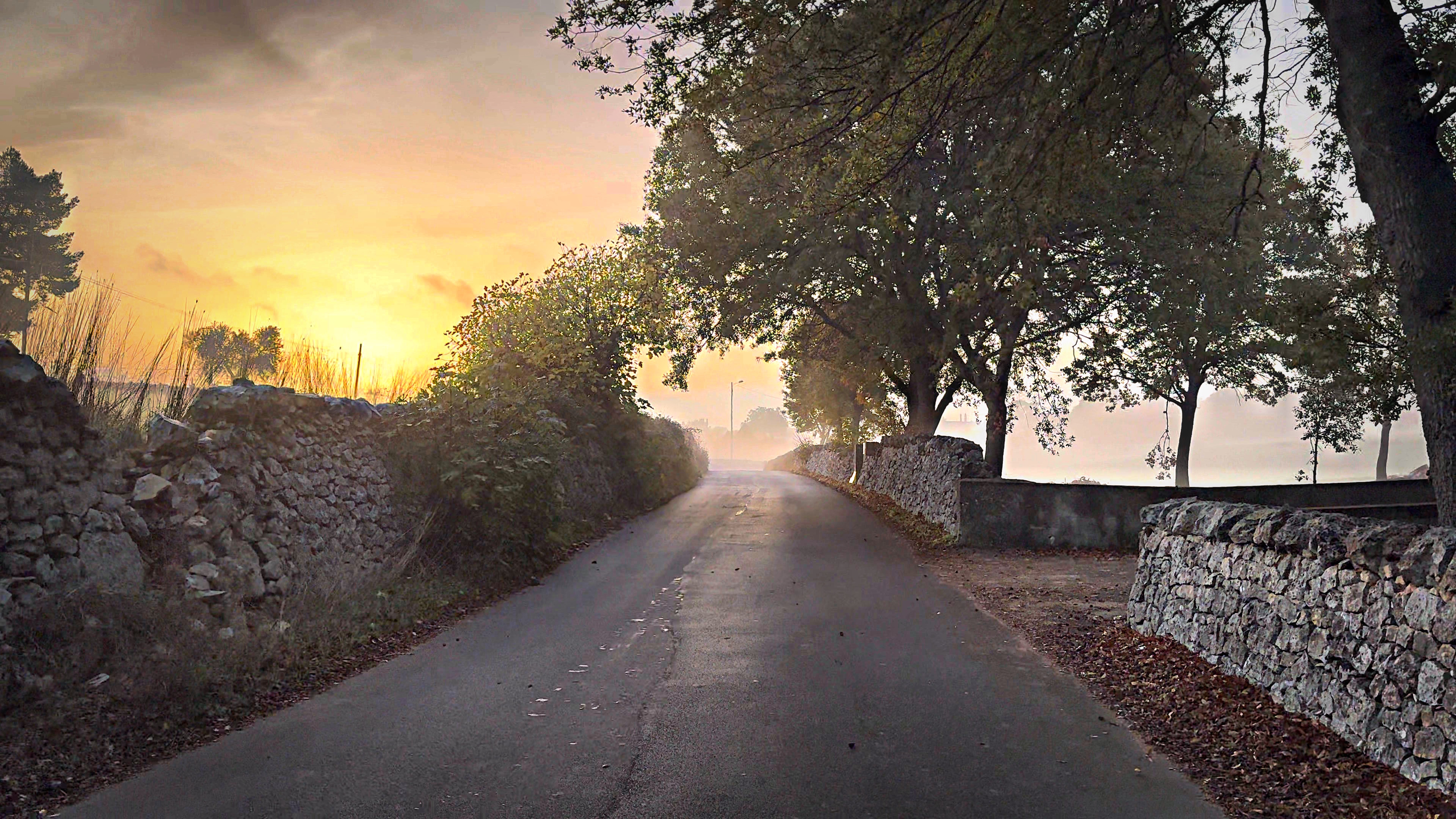 Aveam frontala, dar n-am apucat să o folosesc prea mult. Lumina dimineții a venit mai repede decât mă așteptam. Am ieșit din Alberobello și am intrat pe drumurile alea pe care le iubesc — cu ziduri de piatră, cu livezi de măslini, cu trulli risipiți ca în povești. Soarele începea să se ridice, iar peste tot se așeza o ceață subțire, de parcă toată Puglia stătea între somn și trezire. Ceața învăluia văile și măslinii parcă ieșeau încet dintr-o lume de vis, iar lumina caldă încerca să se strecoare printre ei. Era un cadru pe care nu-l poți descrie complet, trebuie să-l trăiești.