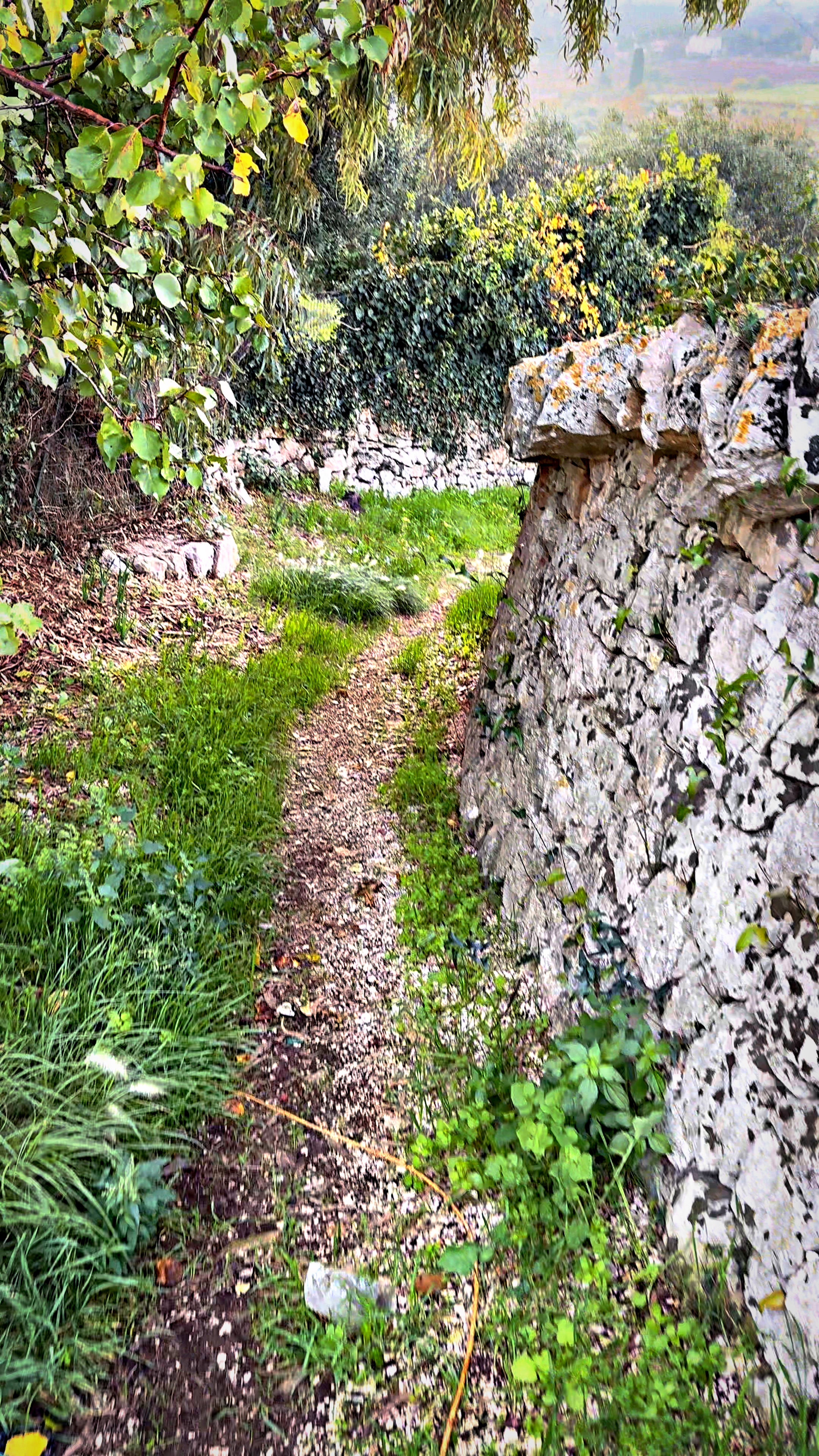 După treptele cu "Libera la mare" — le știi deja 🤭 — am făcut stânga spre Cisternino. Am început să alerg pe drumul ăla, dar era prea serios, aproape ca un drum expres, nu foarte circulat, dar prea... "rutier" pentru ce voiam eu. Mă uitam în stânga, în dreapta, și când am văzut un drum îngust, cu ziduri de piatră, care ducea "in the middle of nowhere"... fix acolo m-am îndreptat. Era, din nou, exact ce aveam nevoie.