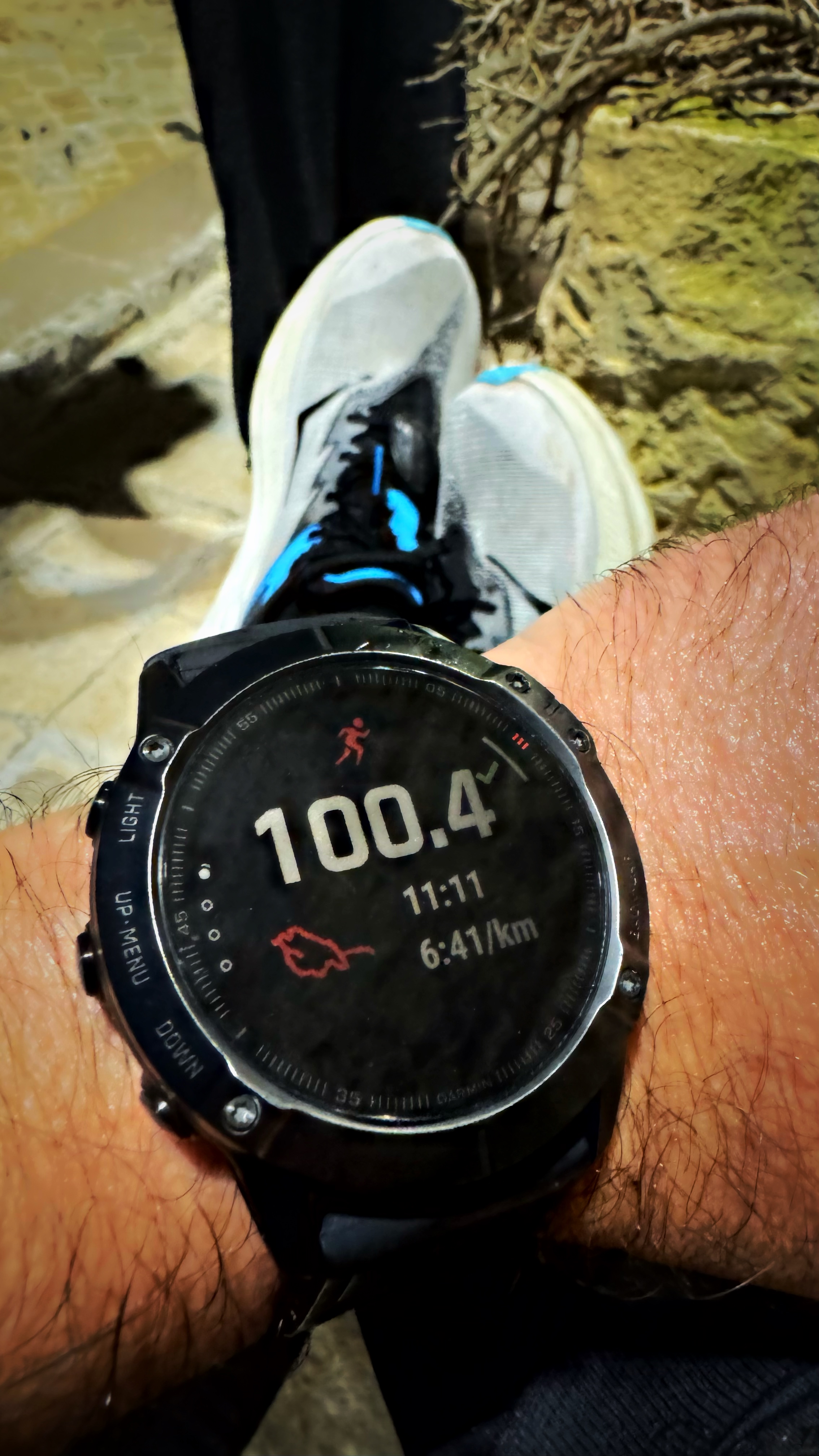 La km 92 am intrat pe "drumul lui Carmen". Drumul ăla pe care îl știam, care-mi dădea liniștea aia ciudată că totul e sub control. Iar la km 95… urlam în gura mare "De ce plâng chitarele". Singur pe drum, în sudul Italiei, cu 95 km în picioare, cu soarele coborând peste măslini, cu dor și cu bucurie amestecate în același nod din gât. Era genul ăla de moment în care nu-ți mai pasă de nimic: nici de pace, nici de puls, nici de cine te aude. Era doar libertate. În cinci kilometri urma să închid suta.