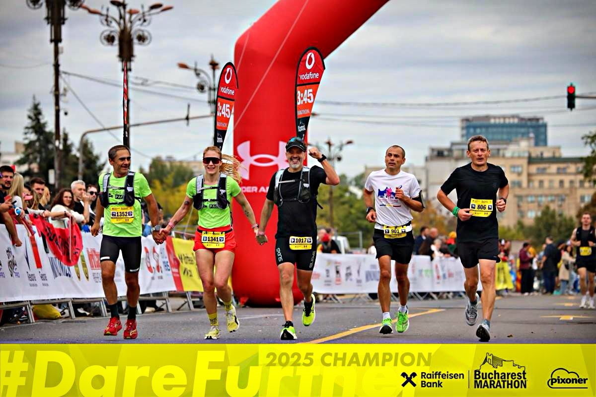 Iar ziua maratonului a închis cercul. Am intrat în cursă încărcat de emoții, cu post-COVID-ul agățat de respirație și cu teama că nu o să duc ritmul, dar aveam o singură regulă: dacă am spus că duc steagul la 3:45, îl duc. Și l-am dus. Greu, dar curat. Am trecut finishul cu Vasile și Deea de mână (ceilați doi paceri), epuizat și fericit, și în momentul ăla am simțit că tot proiectul și-a atins scopul. Nu a fost despre timp, nu a fost despre pacing perfect, ci despre comunitate, despre energia oamenilor și despre faptul că am terminat exact ceea ce am promis. Și cred că asta rămâne una dintre cele mai mari realizări ale mele de anul ăsta — poate chiar cea mai mare.
