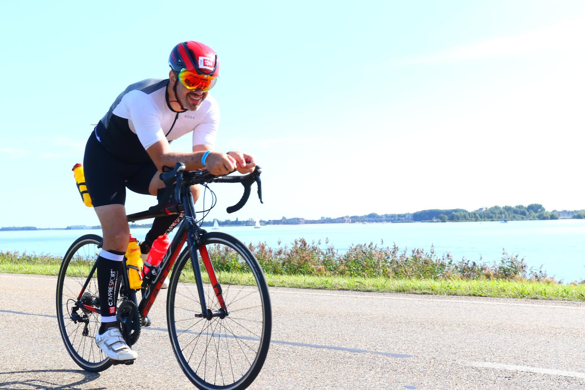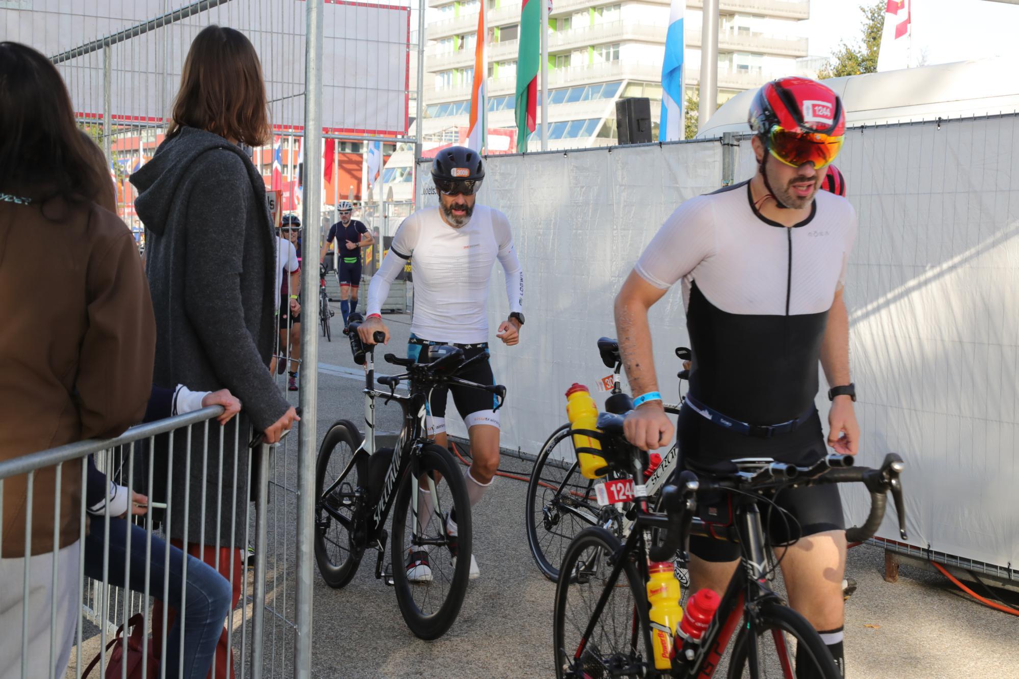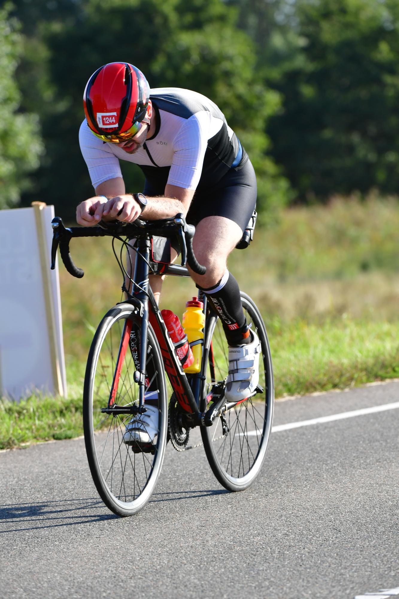 Mi-am dat jos neoprenul, mi-am pus casca, pantofii de biclă, am băut licoarea pregatită din timp și un gel, și-am plecat spre locul în care se afla bicicleta. După ce-am luat-o de pe rastel și-am început să alerg, am constatat că cele 12 grade de afară combinate cu costumul ud vor fi un bun stimulent pentru startul probei de ciclism. Și așa a și fost. Pentru că mi-era foarte frig, iar varianta de a merge mai încet era exclusă, am tras cât a fost nevoie ca să mă încălzesc, și totodată, să mi se usuce costumul. Vântul a bătut de la început, dar parcă în prima parte a ținut cu mine. Până la km 100 am reușit să scot o medie de 32.3 km/h. Apoi a inceput distracția. Vântul parcă bătea numai din față, energia nu mai era aceeași ca la început și am lăsat-o mai moale. Pe ultimii 10 km am făcut un cool down, cu o oprire la toaletă pentru că nu mai puteam și din mers nu mă “prea ține”. Nutriția a funcționat conform asteptărilor și cât se poate de simplu. Planul era de trei geluri pe oră plus izotonic și apă la punctele de hidratare. Ca să nu-mi complic viața cu desfăcutul gelurilor, în dimineața competiției le pun pe toate (cele pentru biclă) într-un bidon și-i mai adaug niște apă. M-am obișnuit deja cu cantitatea pe care trebuie s-o iau la fiecare 20 minute. O “gură zdravănă”. Am terminat proba în 5:55:42, cu o medie de 30.36 km/h, un timp bun, chiar record personal pe această distanță. Am lăsat bicla și m-am dus să mă schimb pentru urmatoarea probă.