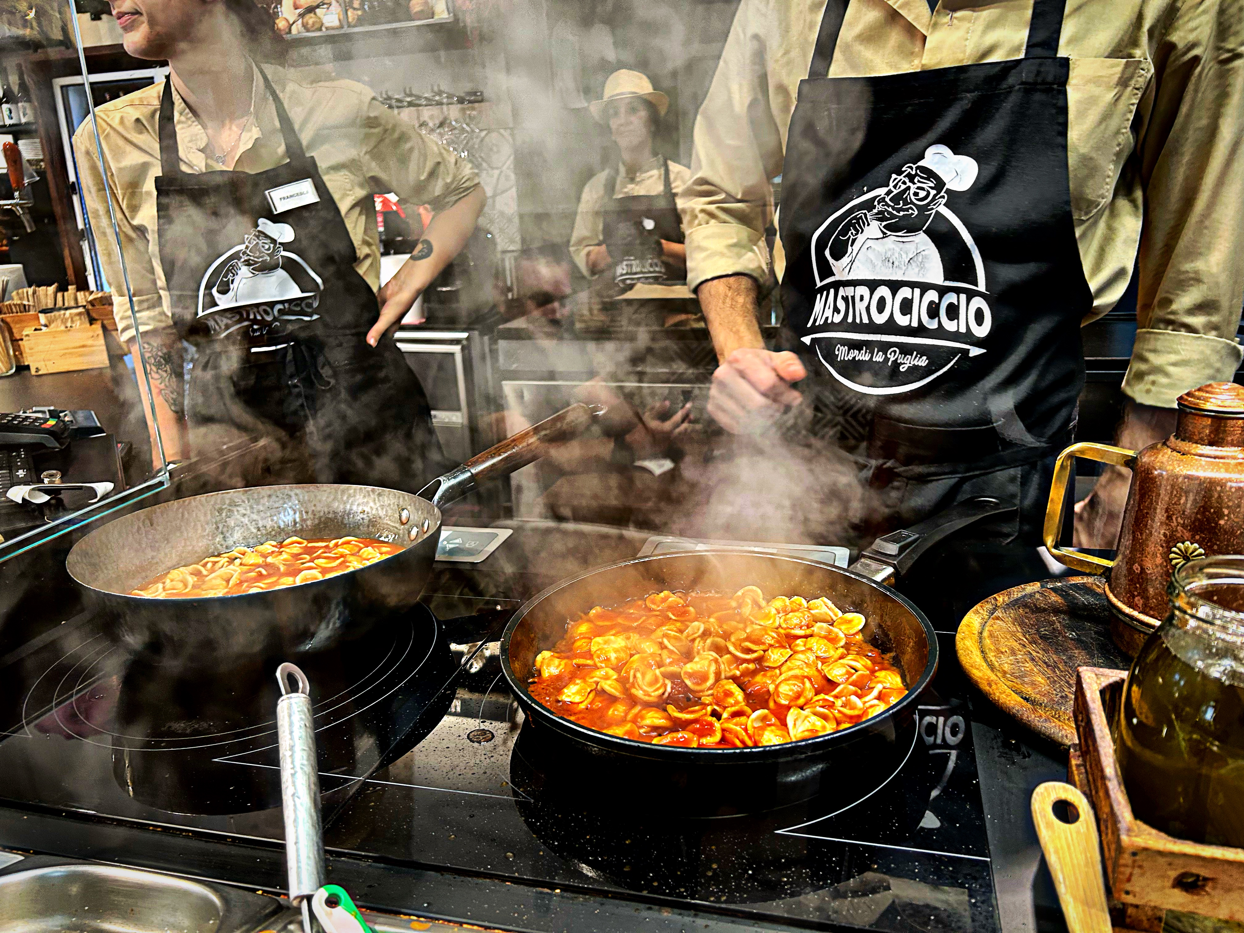 În Bari, nu rata orecchiette 🍝, paste servite cu cime di rapa, sau riso patate e cozze (orez cu cartofi și midii). La desert, optează pentru sporcamuss (foietaj cu cremă) sau cartellate (prăjituri tradiționale de Crăciun cu miere 🍯).