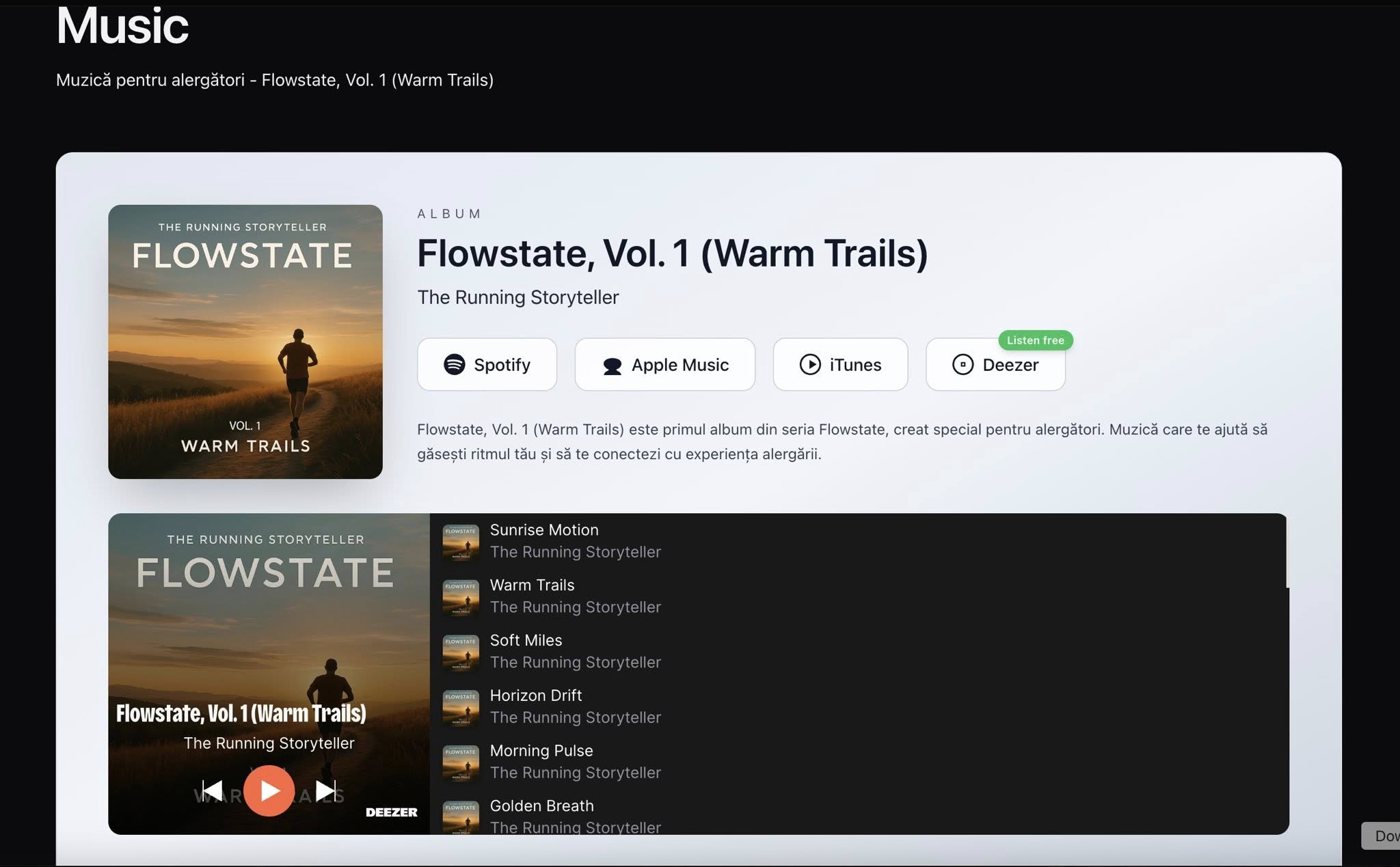 Printre altele, am scos primul meu album de muzică. 😍 E genul de muzică liniștită, care merge la alergare, la muncă, când ai nevoie să te concentrezi, dar și la drum lung cu mașina. Muzică de flow, fără grabă. Volumele 2 și 3 sunt deja pregătite, doar că n-am apucat încă să le lansez. Albumul poate fi ascultat pe platforme gen Spotify, Deezer și altele, cumpărat de pe iTunes și folosit inclusiv pe Facebook și Instagram pentru reels.