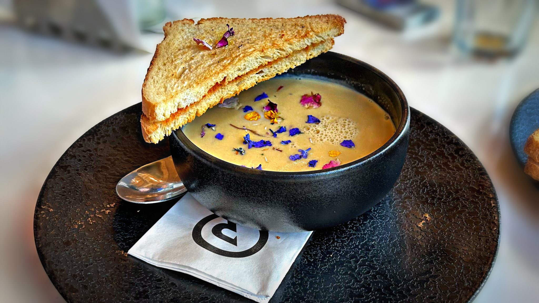Ne-am bucurat toți trei că am recuperat drona și ne-am întors la Oxygen pentru o cafea și să mai stăm de vorbă cu proprietarul. Foarte fain tipul, îl cheamă Csongor, și am ajuns, normal, să discutăm și despre mâncare. Bucătarul lui e super priceput și dintr-una-ntr-alta ne-a pomenit de ceva absolut incredibil: supă cremă de fân. Da, ați citit bine – fân.