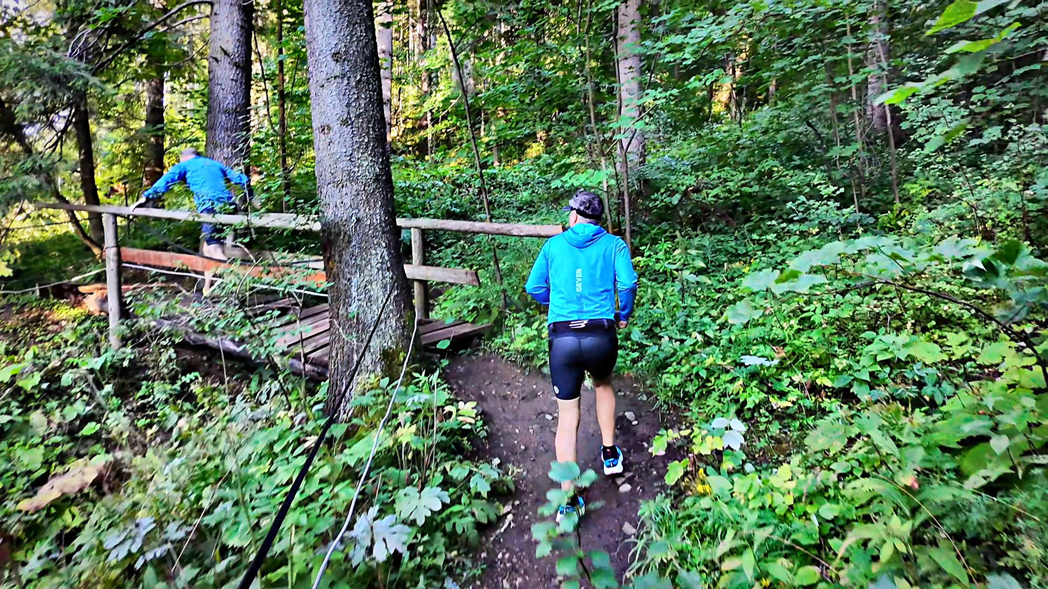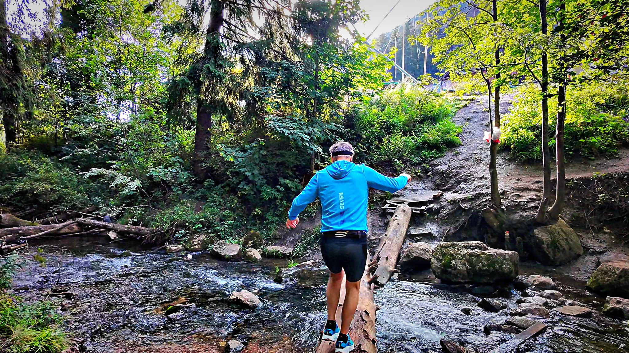 Peste pârâu era un bustean mare și ud, niște pietre și o chestie de beton pe lângă. Eu am trecut lejer, Paul cu ai lui Cliftoni a luat-o pe partea mai sigură. Oricât de încântați am fi noi de Cliftoni și pe ce suprafețe nebune am alergat cu ei, nu fac chiar minuni pe busteni uzi cu apă dedesubt. Mai bine treci cu ei prin apă. 😂 Challengerii însă… parcă se lipiseră singuri.