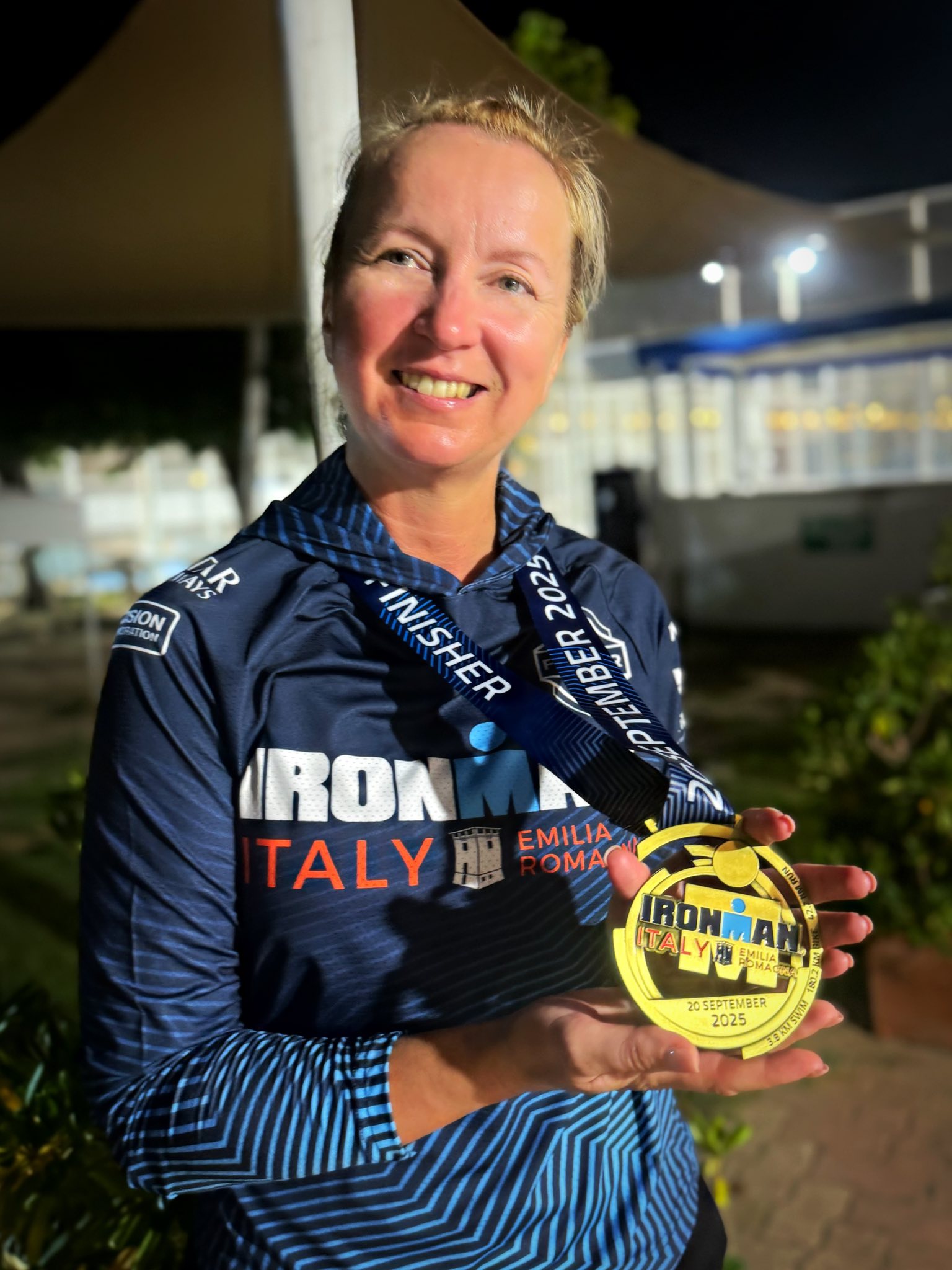 Am luat-o pe traseul care ducea spre „Last Lap / Finish Line”. Auzeam MC-ul cum strigă câte un nume urmat de „You are an Ironman!”. Vedeam în bezna de pe cer cum reflectoarele luminau totul. Încă puțin… alerg pe drumul pe care am venit de la tranziție… fac stânga și intru pe covorul roșu care duce pe plajă… apoi fac dreapta și văd în față linia dreaptă.