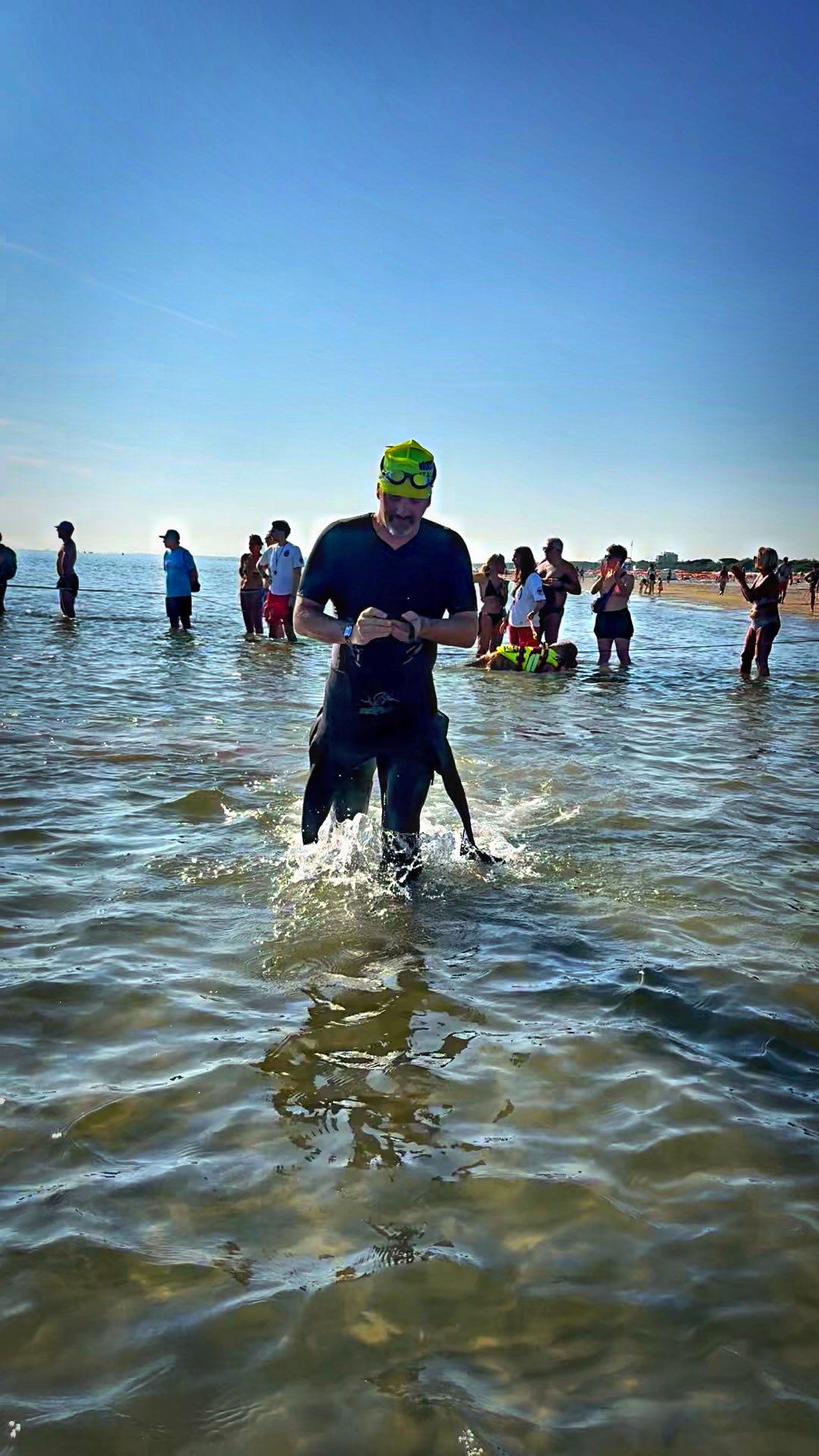Apoi s-a dat startul. Mai întâi cei de la PRO, apoi noi, restul amatorilor. Ce să zic, m-am pus mai la coadă, deși tot erau o grămadă după mine. Startul se dădea pe 6 rânduri la fiecare 9 secunde. Carmen a stat cu mine până la capăt. Chiar m-a ținut de mână până în momentul în care s-a auzit ultimul beep și-am luat-o la fugă spre apă.