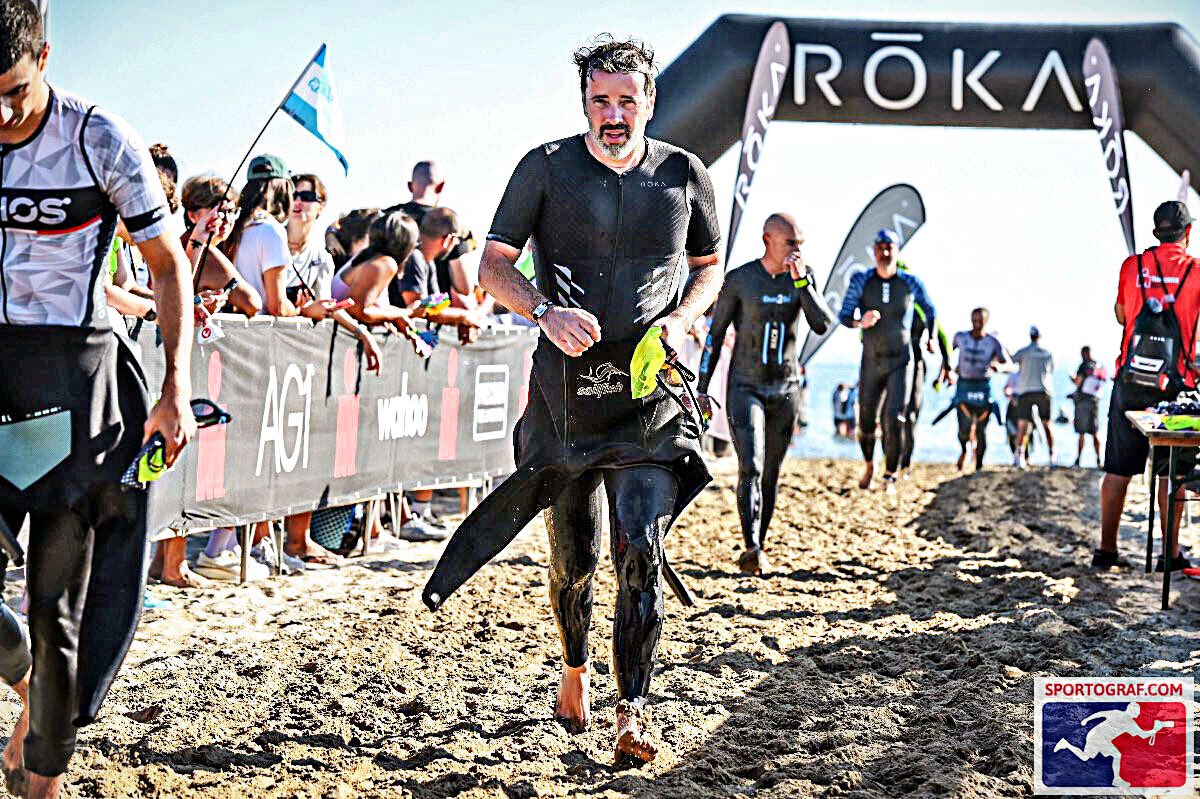 De pe la 2500 m, totul a intrat în normal. Ne-am văzut toți de direcția noastră și ne-am îndreptat spre ultima cotitură spre mal. Am înotat până apa a devenit prea mică, apoi am luat-o la pas, cât să pot să-mi dau jos partea superioară a neoprenului, că mă cam încinsese. În timp ce mă îndreptam spre ieșirea din apă, încadrat de susținători pe partea stângă și pe dreapta – super fain! – o văd și pe Carmen, care mă încuraja. Am făcut și o tură până la ea, că doar n-aveam să trec pe lângă fără s-o pup 😂. Poate doar voiam să mă dau bine pe lângă ea… sau simțeam deja că o să am nevoie de ajutorul ei mai târziu 🤭.