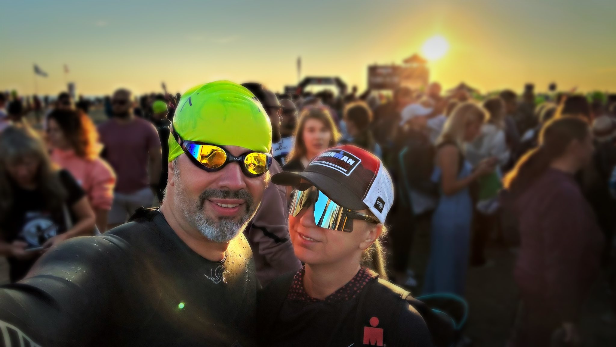 Pe la 5:45 mi-am luat pompa, bidoanele cu carbo și pe cele cu apă și m-am îndreptat spre tranziție. Ne-au lăsat să intrăm prin față (să nu facem 2 km aiurea 🤭). Chiar când intram, MC-ul anunța temperatura apei: 24 de grade și neoprenul este permis! Yuuuuu 🎉