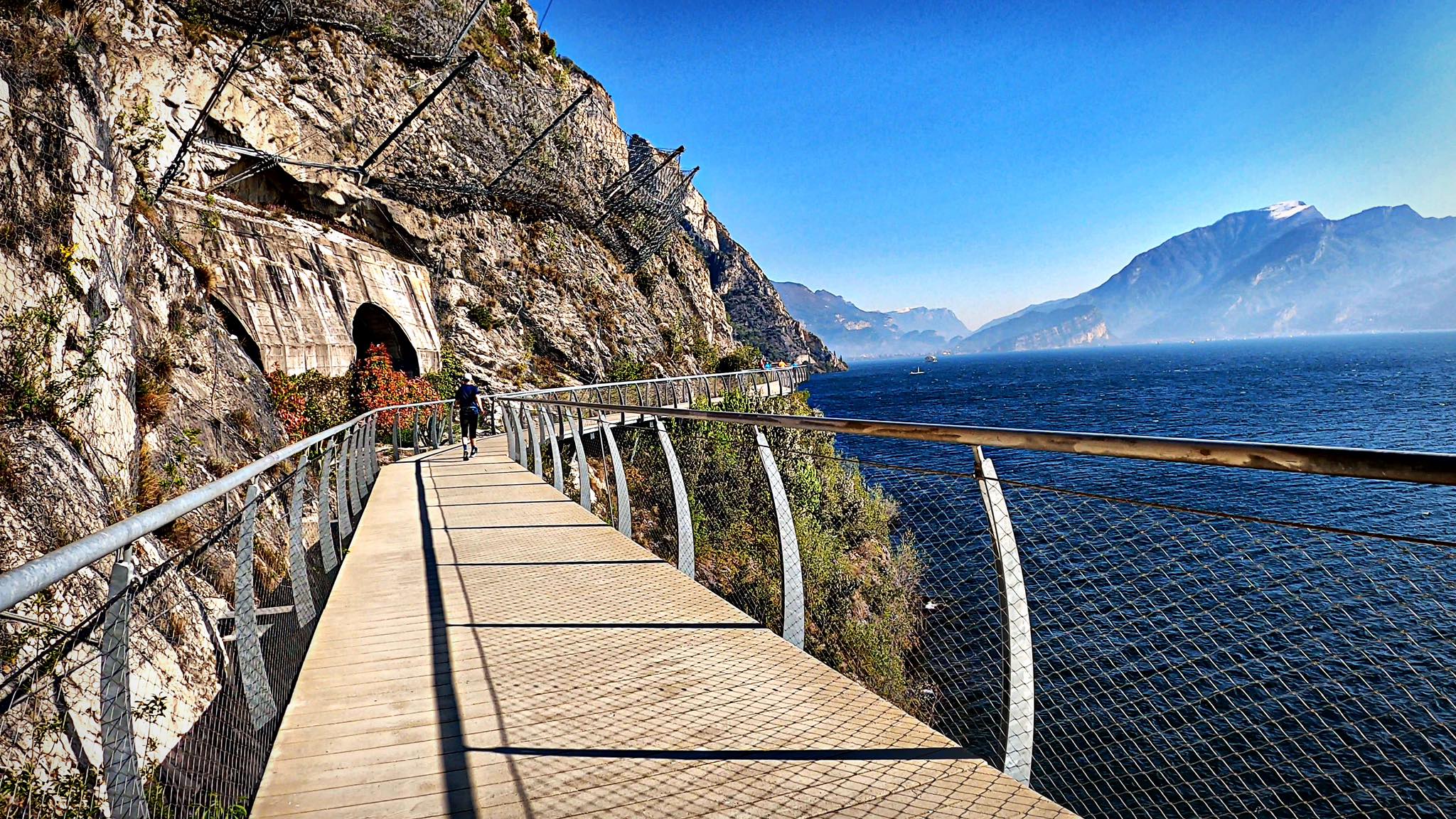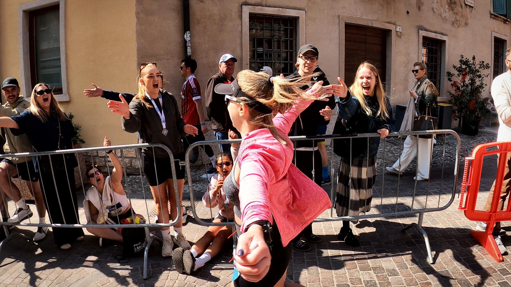 Apoi, a urmat partea aia de suspended bike path, pe stâncă, deasupra lacului – câțiva kilometri de pur spectacol vizual. După care: tunele, drumuri șerpuite pe marginea stâncilor. Odată intrați în Riva, am trecut direct prin centrul vechi. Oamenii erau deja la terase, cu cafelele în față, în timp ce ne aplaudau și ne încurajau ca pe niște eroi. Atmosfera – de nedescris.