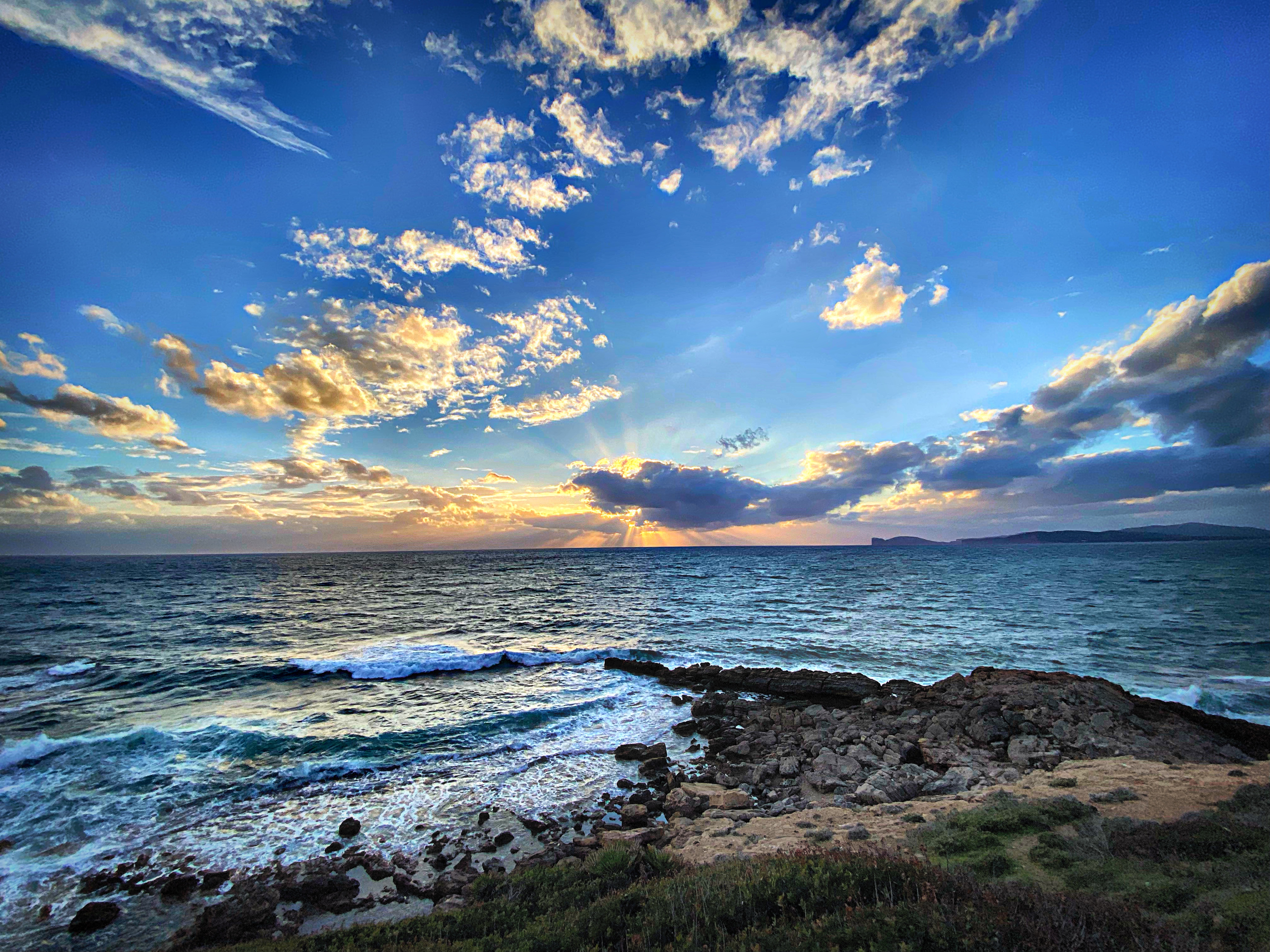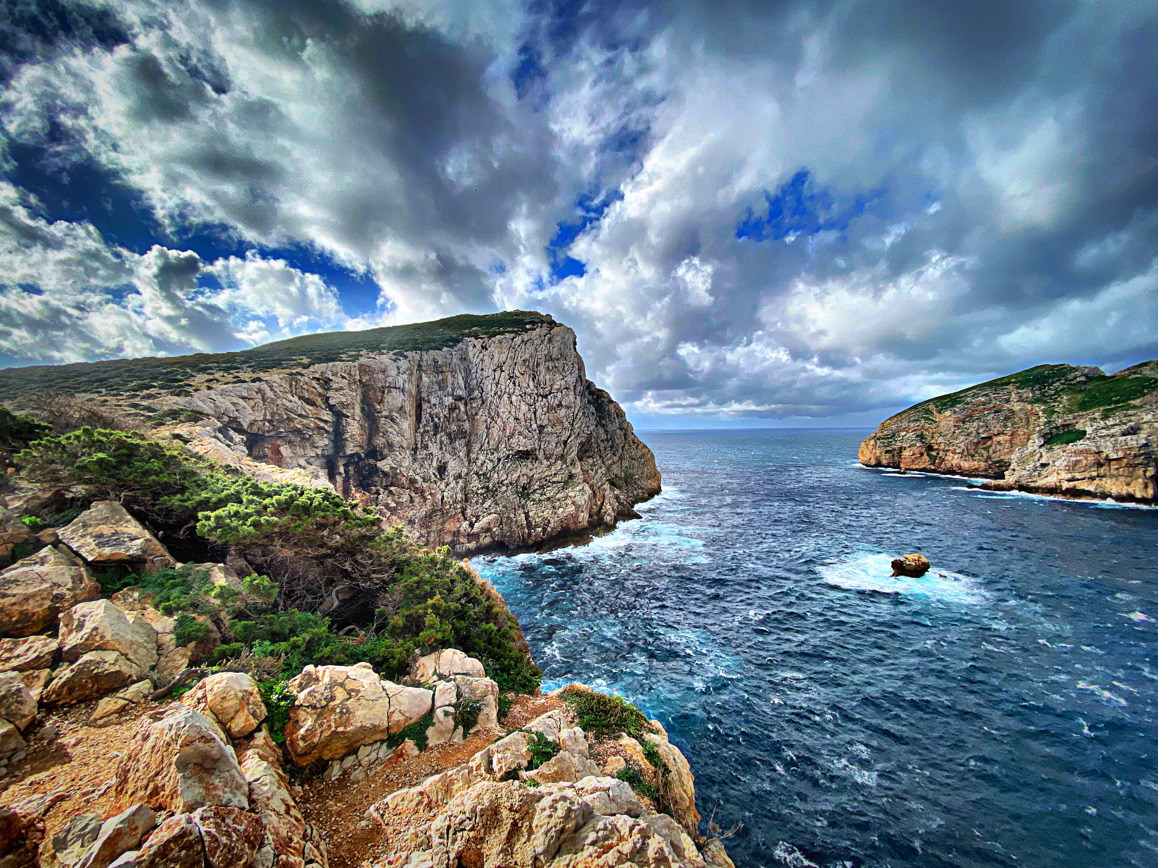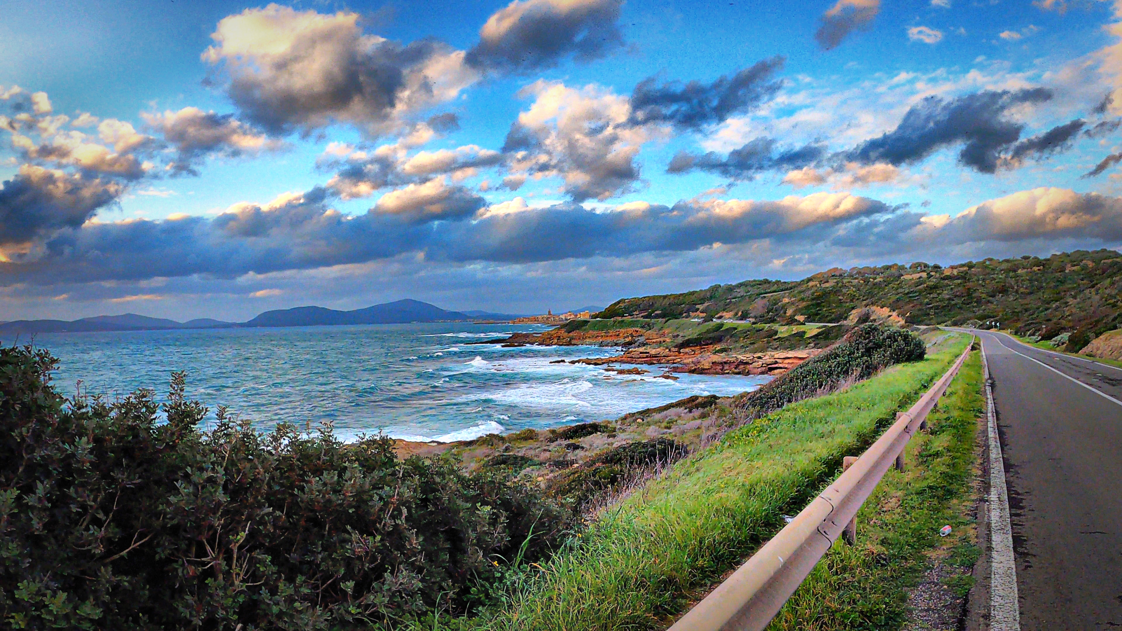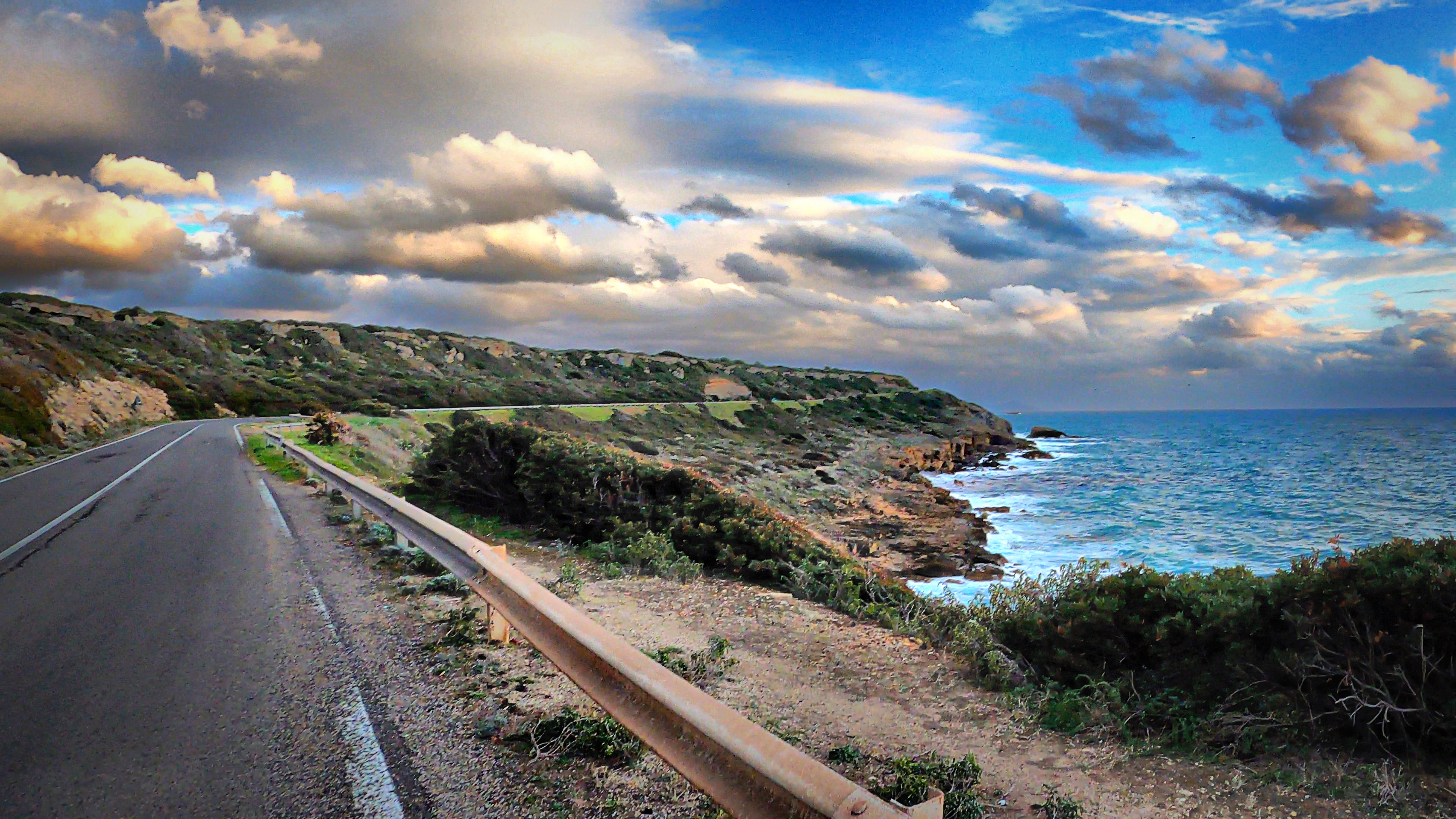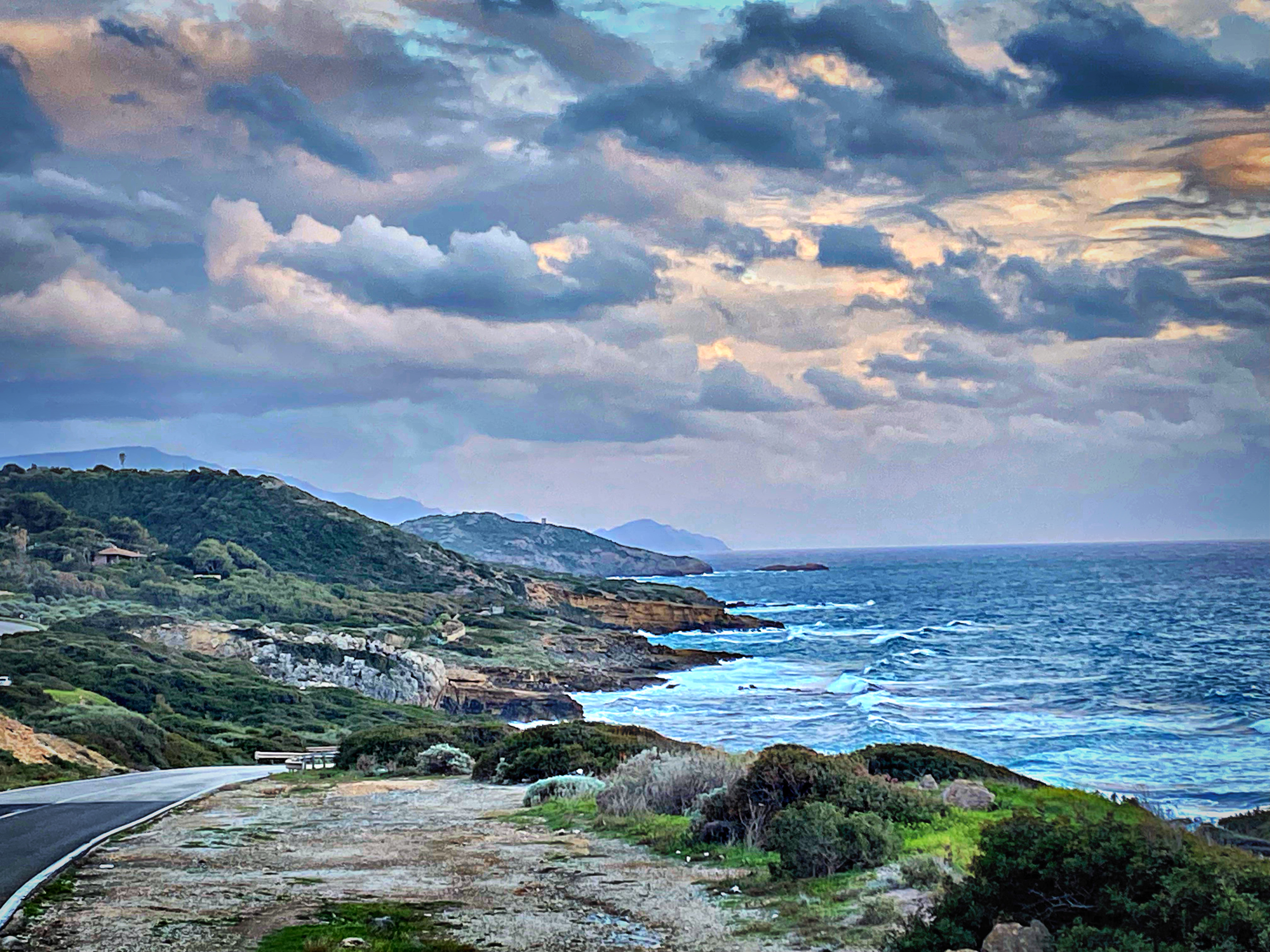 In prima parte kilometrii treceau repede. Am barfit si dezbatut diverse subiecte, ne-am bucurat de peisaj. Desi ploua intr-una cu mici pauze, mai tare sau mai incet, peisajul era tot mai fain. Prima parte o alergam catre Capo Caccia (nord vestul insulei) si desi era in apropierea marii, drumul era ferit in mare parte de vant datorita vegetatiei. Pana pe la km 20 nu s-a intampla nimic interesant. Povesti si multa apa. Apoi am observat ca soarele incearca sa iasa dintre nori, iar la km 23, la Capo Cacio a reusit sa-si faca loc. Vali se lauda ca a facut incantatii. Il cred daca el zice asa ? Soarele iese pentru putin timp, dar suficient cat sa facem niste poze superbe. Apoi s-a ascuns iar si a inceput ploaia.
