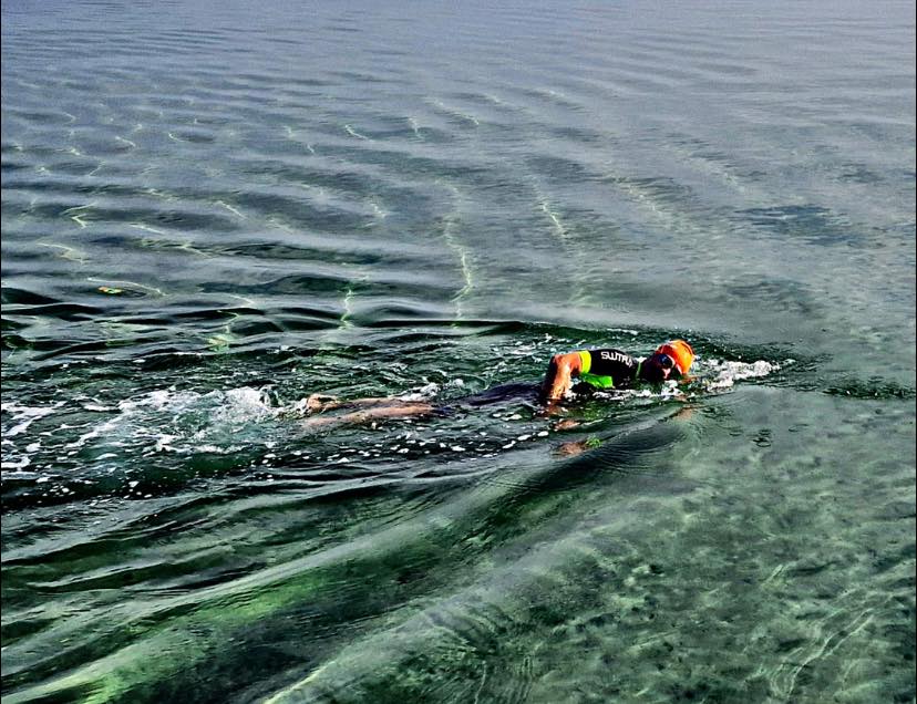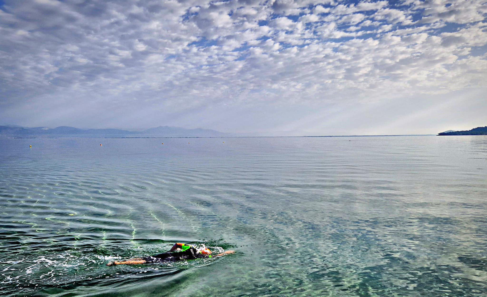 Ajung pe malul apei si constat ca e de vis. Arata ca o oglinda. Nu bate vantul, nu sunt valuri, temperatura ei e placuta. Fac cateva poze si postez pe Facebook. Imi fac incalzirea. E 7:35, imi iau inima in dinti si pornesc. Chiar inainte sa iau startul, cu cateva minute, a aparut un pescar pe pontonul din apropiere. M-am bucurat sa-l stiu acolo pentru ca in mintea mea ma gandeam ca poate in felul acesta nu mi-o umbla nimeni in boarfe ? In acelasi timp, mi-a parut rau pentru el, pentru ca stiam ca urma sa dau ture prin zona unde voia el sa pescuiasca. Mi-ar fi placut sa inot ~2 km spre Prinos si apoi sa ma intorc, dar nu aveam curaj sa-mi las boarfele nesupravegheate.