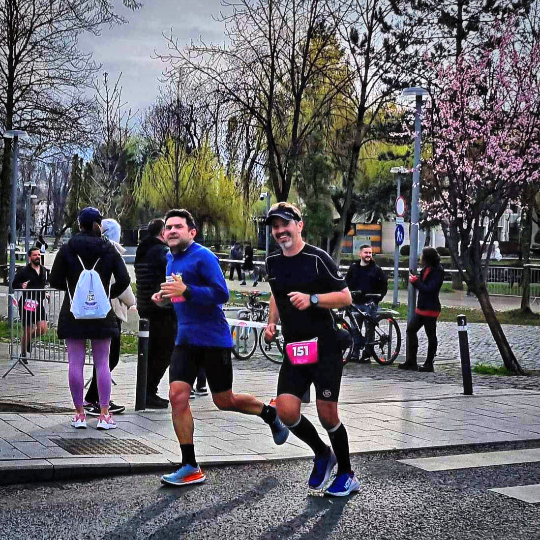 Mai tarziu, l-am cunoscut pe Lucian din Tg. Mures, care si el slabise de la vreo 105 kg si se apucase de alergat. Apoi am mai povestit cu altul, si tot asa alti cativa km. Timpul a trecut repede si placut. Mai faceam glume cu alti alergatori cunoscuti sau nu, cu voluntarii, cu oamenii de pe margine care ne incurajau. Pe la km 38 deja incepusem sa alerg mai tare pentru ca simteam ca pot. Nu m-am grabit sa termin mai repede, nu-mi pasa de timp pentru ca oricum habar n-aveam cat timp a trecut de la start. Din acest motiv am profitat fara graba de fiecare punct de hidratare. Am terminat in forta ultimul km si am realizat ca, in ciuda problemelor, chiar mai aveam energie.